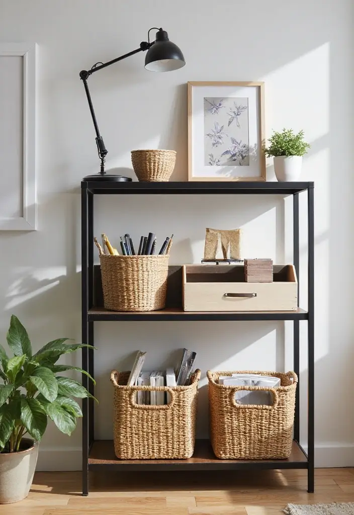 Baskets add warmth while holding odds and ends. Place them on shelves or the floor for easy reach. Woven ones feel cozy and hide papers well.