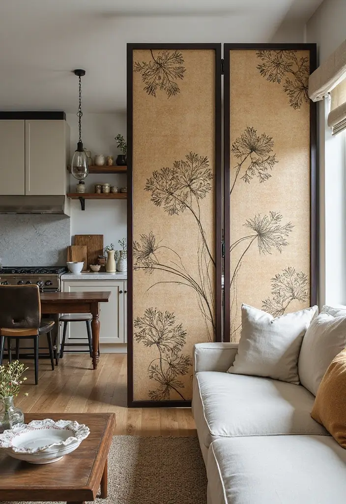 Kitchen and living room partition ideas like bi-fold screens offer flexibility to divide or open your space. Perfect for renters, they fold away for gatherings. Bamboo or fabric screens add texture, and carved designs bring charm.