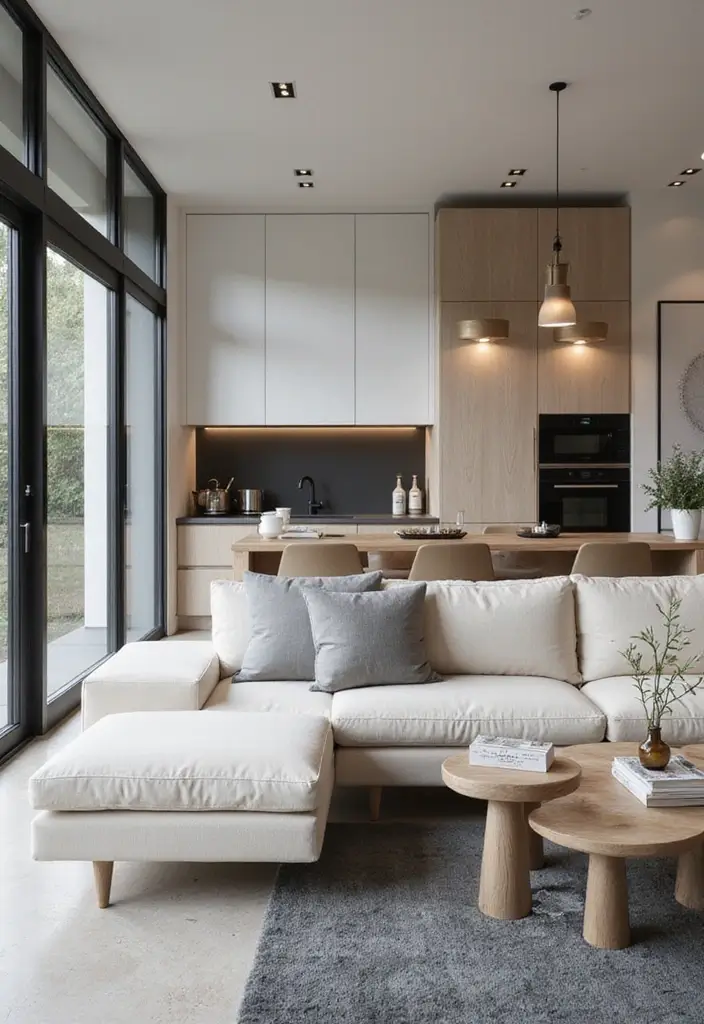 Kitchen living room divider ideas with modular furniture like console tables create natural boundaries without construction. A table behind a sofa doubles as a serving area. Maximize utility with storage-friendly pieces.