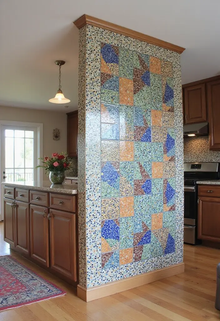 Kitchen wall divider ideas with mosaic tiles add texture and color. Half-walls or panels with glass or porcelain tiles are easy to clean and eye-catching. Create a focal point with patterns that suit Mediterranean or eclectic styles.