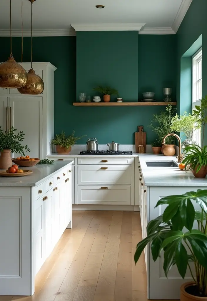 Dare to be bold! Deep jewel tones like emerald green and sapphire blue not only enhance your white cabinets but also create a cozy atmosphere perfect for memorable gatherings.