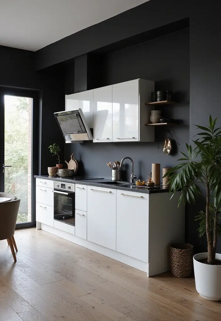 In a world full of colors, black and white bring timeless elegance to your kitchen. Embrace the modern monochrome and let your white cabinets shine against bold walls for a chic, sophisticated look!