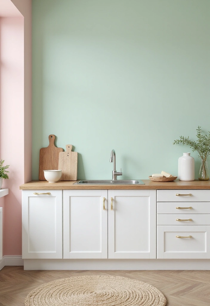 Soft pastel colors, like mint green or pale pink, perfectly complement white cabinets and create a light, airy vibe.