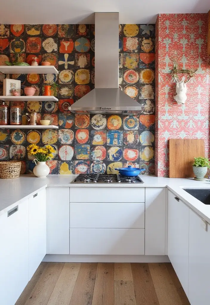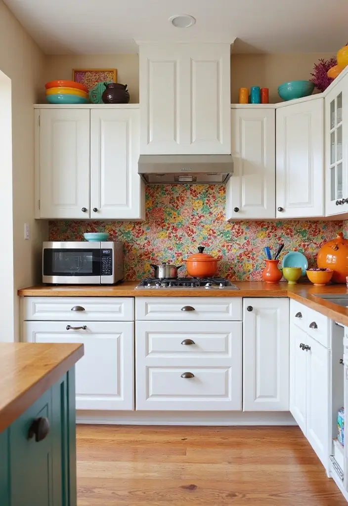 Bold patterns, whether geometric or floral, can add a playful touch that stands out against white cabinets. This approach allows for a burst of personality in your kitchen while maintaining a modern feel.