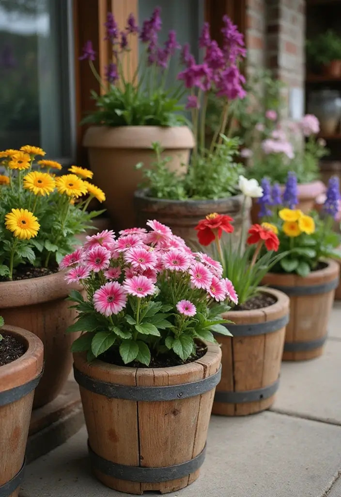 Imagine a variety of weathered wooden pots, each holding a burst of colorful blooms, lined up on your patio or nestled along a garden path. Trends on Pinterest show how these pots can enhance any outdoor space, offering a cozy, inviting feel.