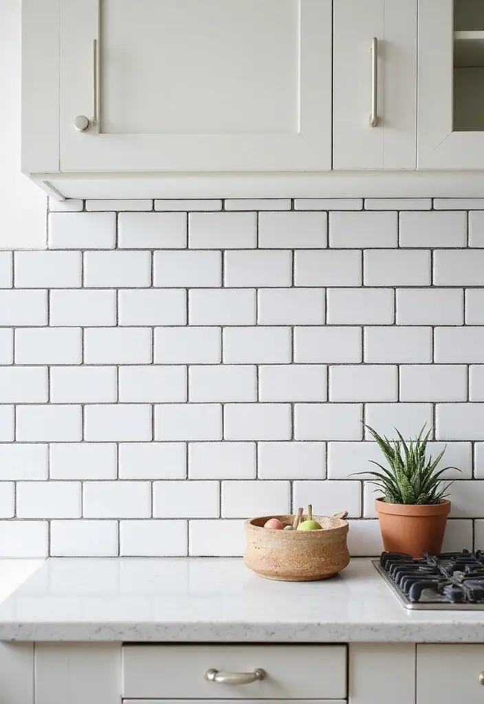 White subway tiles with dark grout, like black or navy, create a bold contrast. The dark lines highlight the tile grid, adding a modern edge. They hide stains well, ideal for busy kitchens.