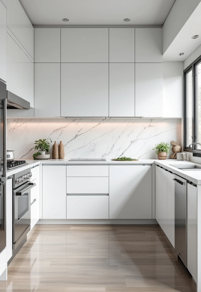 Marble slabs offer a refined look with soft veining that adds texture to your white kitchen. Their natural beauty creates a focal point without overwhelming the space.